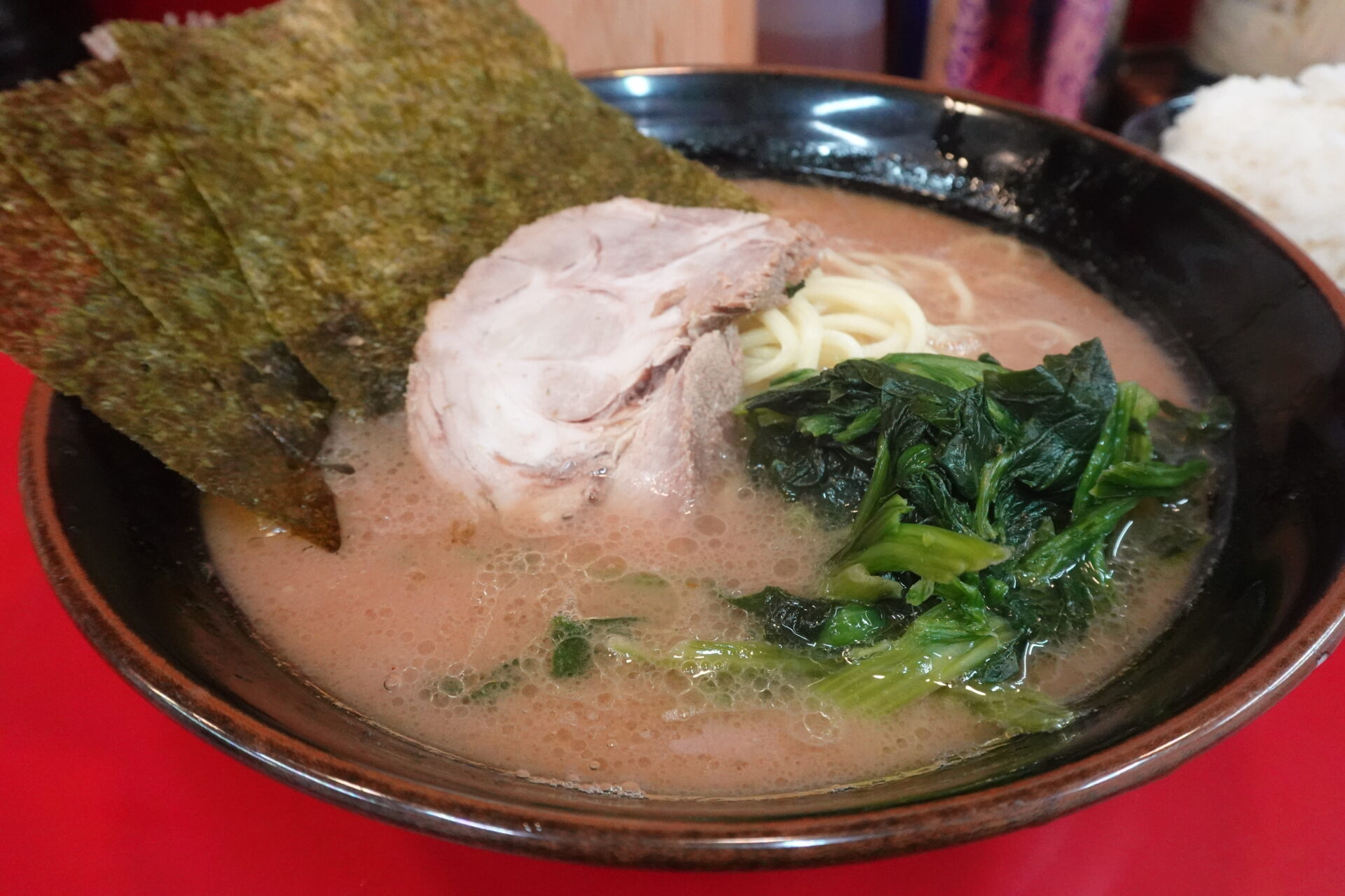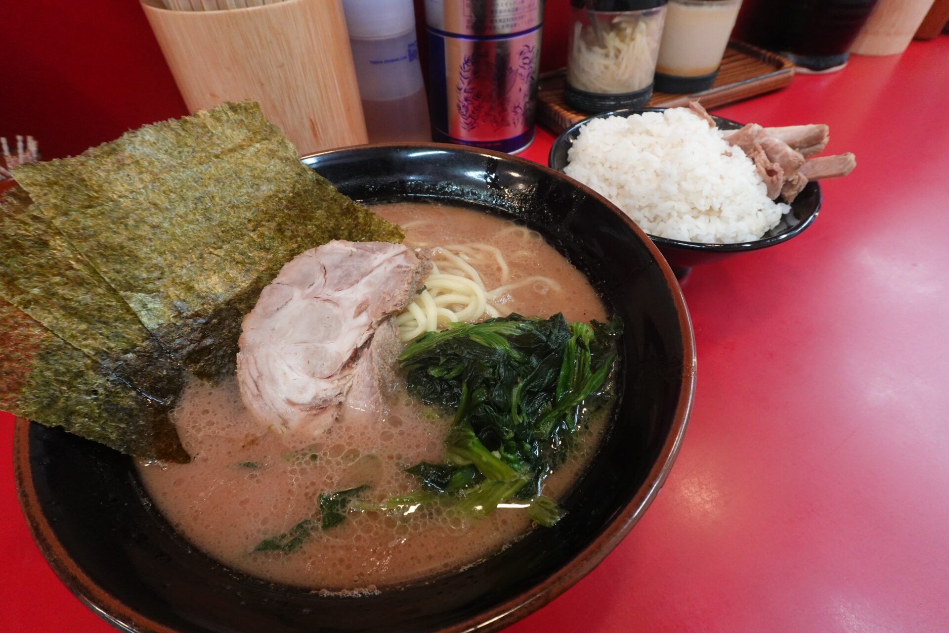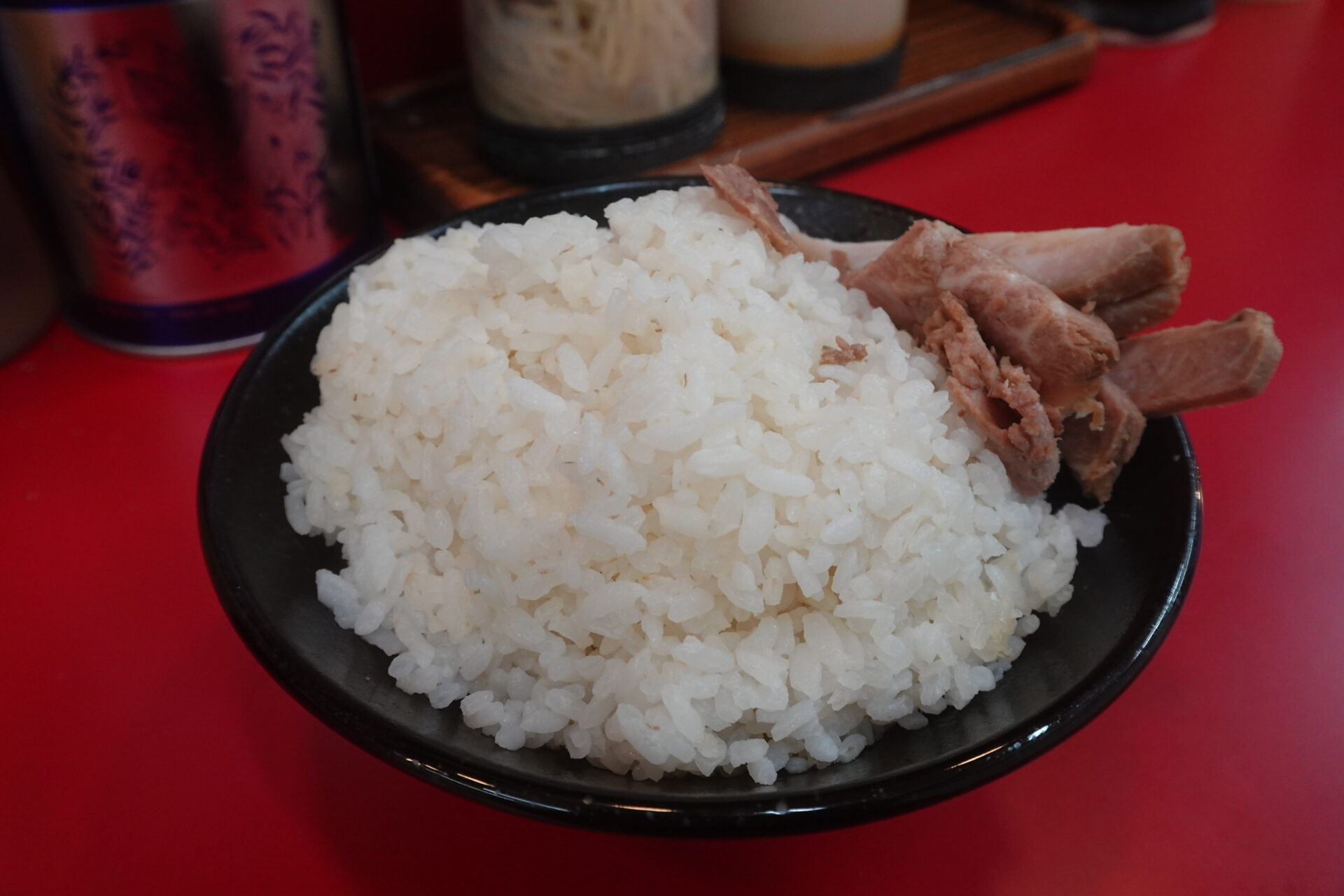 ラーメンをかため、濃いめ、多めで注文し、久しぶりに聞いた「ライスいりますか?」の質問にもしっかりと返答を行いました。通常であれば男性の拳よりも一回り大きいぐらいのライス(?)を提供していただくのですが、店員の方から出されたライスにはチャーシューが乗っており、創業価格でありながらオープン当初よりもお得なサービスになっていました。