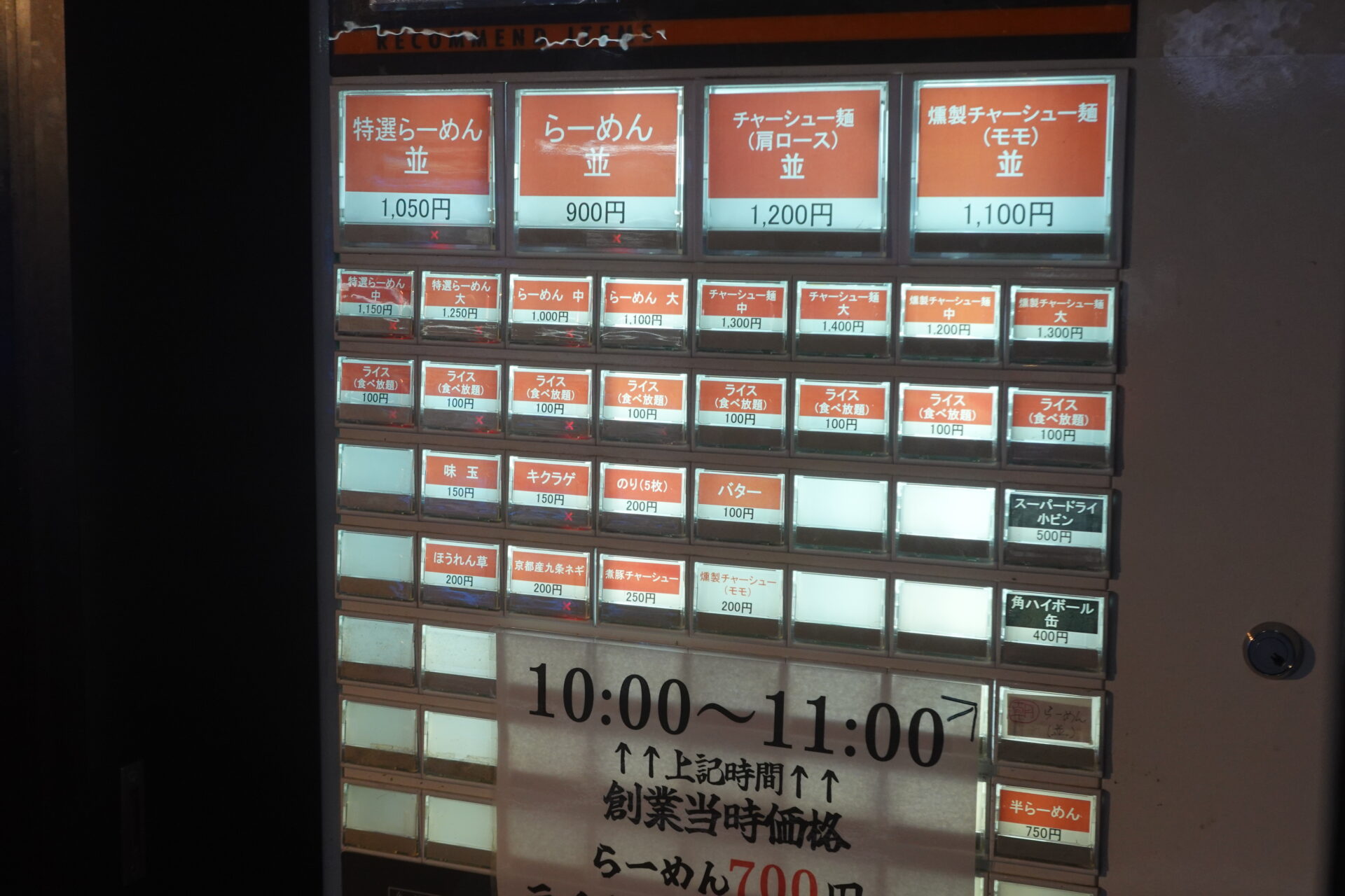 LED撮影時に起きるフリッカー現象の関係で中途半端な「表記」になっているように見えるのですが、券売機ではラーメン700円の部分しか購入可能なランプがついておらず、その他の部分はほとんど売り切れの状態になっていました。後に店員の方同士がしていた会話によると、チャーシュー麺の所にも購入ランプがついていたそうですが、こちらは単純に設定上のミスだったようです。