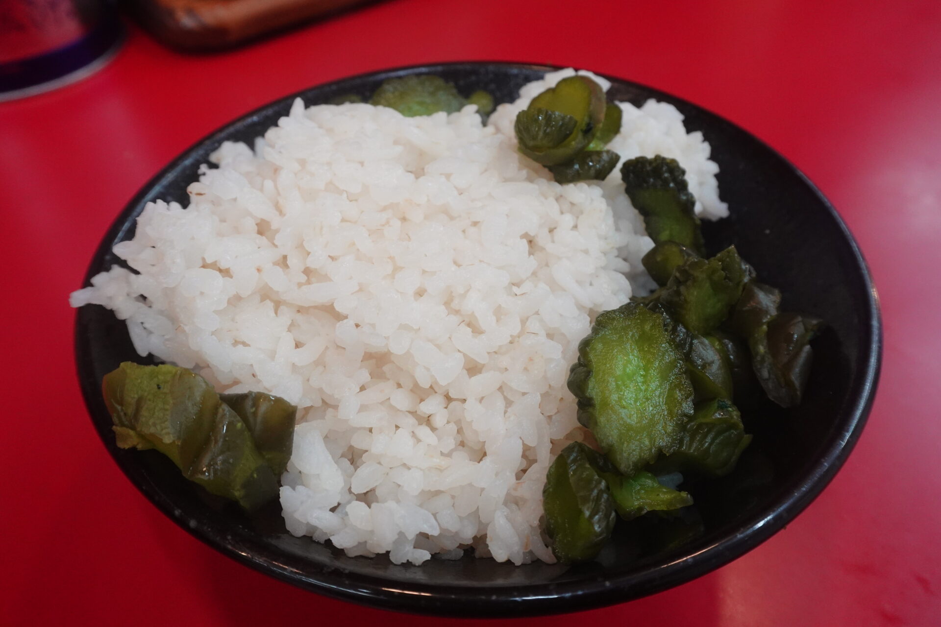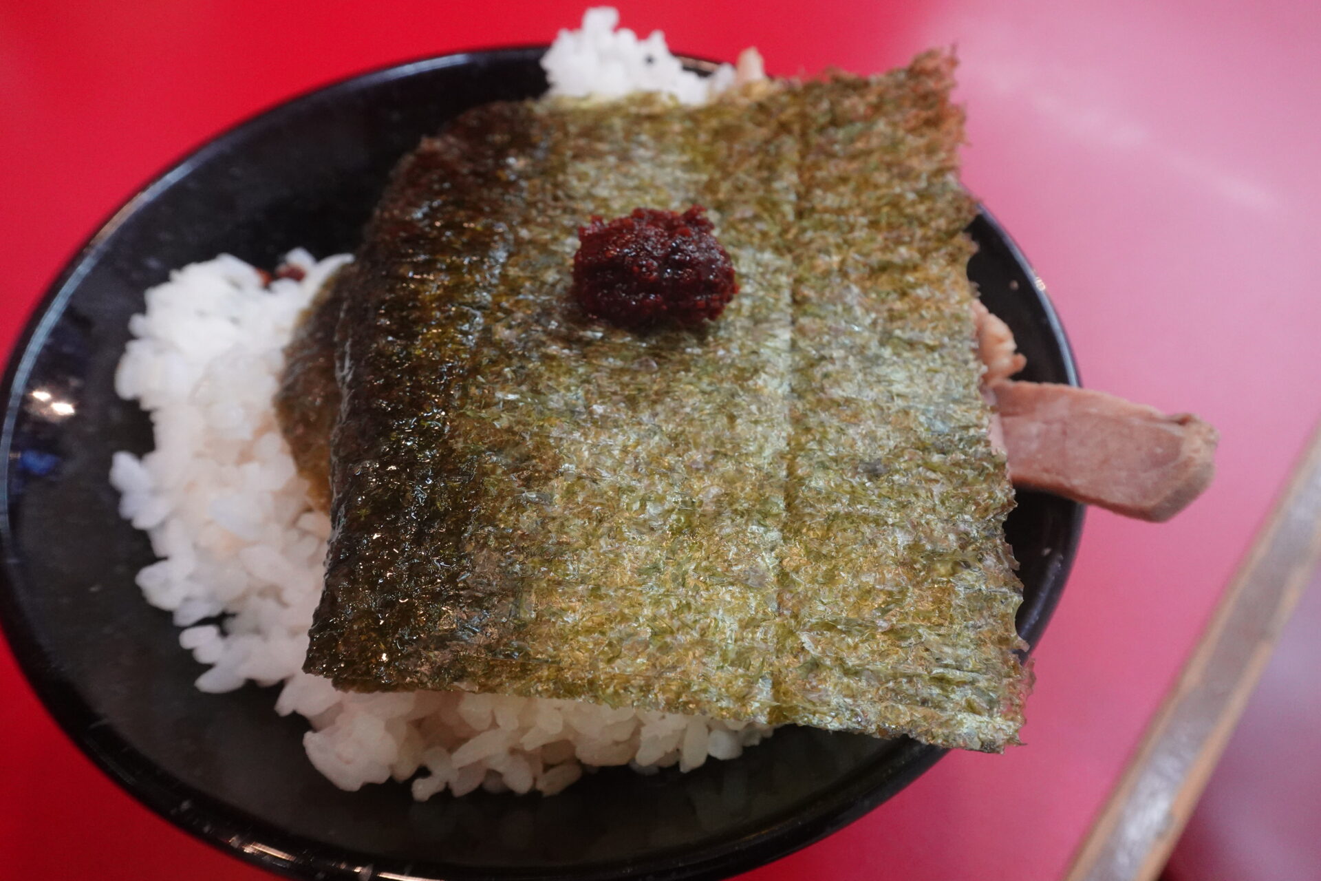 その後すぐにラーメンも到着し、早速朝からパンチのあるスープをいただきました。ライスはデフォルトで乗っていたチャーシューに加え、ラーメンの海苔、福神漬け、豆板醤、ブラックペッパーなどを自由に使用し、およそラーメン店のライスとは思えない状態にしながら、存分に楽しませていただきました。ただ、そこまで空腹でないタイミングで不意に訪問してしまったため、おかわりは1杯だけで収めることにしています。ちなみに、その後は満腹度が一向に下がらなかったため、20時過ぎにBASE FOODのあんぱんを1個かじるだけの1日になりました。